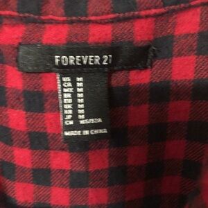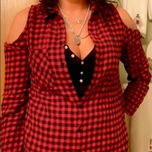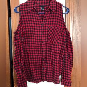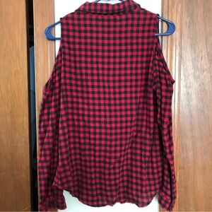 😘 Forever 21 Plaid Long Sleeve Shirt w/ cold shoulders red & black Sz- medium
