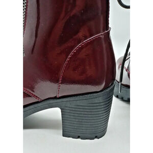 Step out in style with the Forever 21 Chunky Platform Combat Ankle Boots, a perfect blend of fashion and comfort. These oxblood red boots, in size 7.5, showcase a robust patent leather upper complemented by a versatile round toe design. A mid-height block heel provides a stable lift, measuring between 2 to 2.9 inches, ideal for all-day wear. The boots feature a secure zip closure, ensuring a snug fit, while the slip-resistant rubber outsole offers stability on various surfaces. Suited for an array of occasions, from casual outings to cocktail parties, and even for travel or workwear, these boots are a year-round companion, ready to enhance your ensemble with their punk-inspired aesthetic.