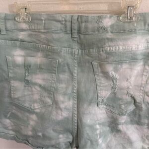 Trendy mint tie-dye jean shorts. Distressed details. Rolled hem. Perfect for casual wear.