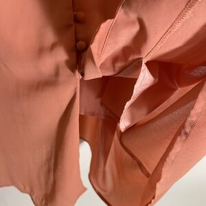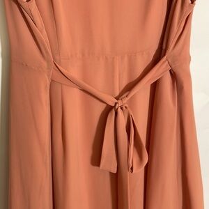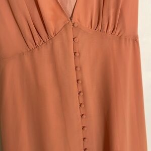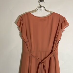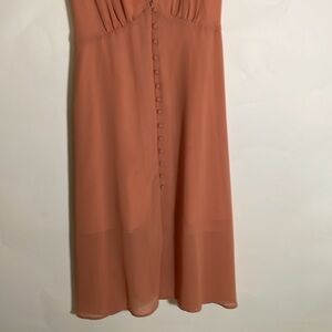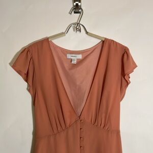 So pretty for spring and summer! This Forever 21 dress in a peachy rose pink color has a v-neck and fluttered caps sleeves. A trail of small fabric buttons travel from the bustline down the front of the skirt. Mid-length. The skirt is lined. The waist tie that ties at the back is the perfect finishing touch, giving the piece that hourglass shape. So flowy and lightweight, this is the perfect dress to wear to a wedding or another semi-formal event! Women's size 3X. Excellent pre-owned condition, no flaws. Measurements in photos.