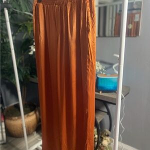 Elevate your style with these chic satin wide-leg pants. The rust color adds a warm, sophisticated touch to any outfit. Perfect for both casual and formal occasions.