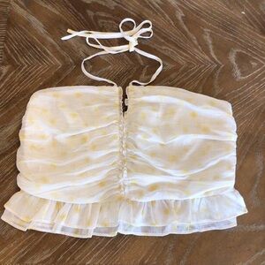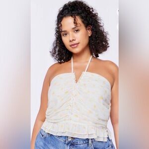 Forever 21 Plus Yellow Polka Dot Print Metallic Ruffled Halter Top Size 0X. New with tags. From smoke free home. *top only. No other items in photos included. Top clipped on mannequin.