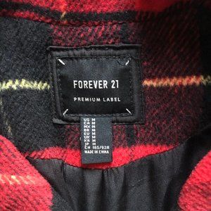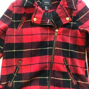 This is a wool-blend moto jacket from Forever 21 Premium Label in women's size medium. It has a red, black & yellow plaid patterned design with an asymmetrical zip front, collared neckline, zippered hand & chest pockets, and long sleeves with zippered cuffs. Chest: 18" across from pit to pit. Length: 24". Sleeve: 24". Still in good condition, having only worn it a handful of times.