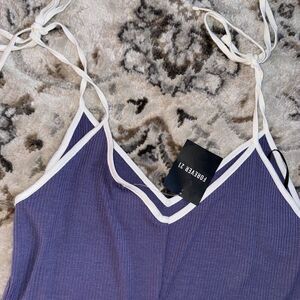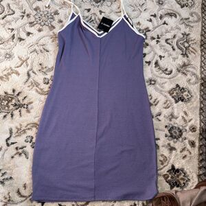 This beautiful purple dress from Forever 21 is perfect for any party or cocktail event. The sleeveless design and V-neckline add a touch of elegance, while the pullover closure and strap accents give it a unique look. The dress is a size large and has never been worn, making it a great addition to any wardrobe. The solid pattern and short length make it a stylish and comfortable choice for any occasion.