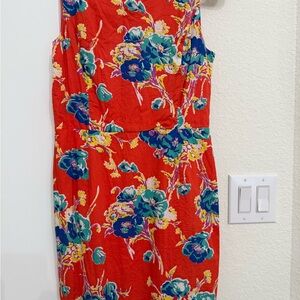 Bright red midi dress with vibrant floral design. Sleeveless and stylish. Perfect for any occasion.