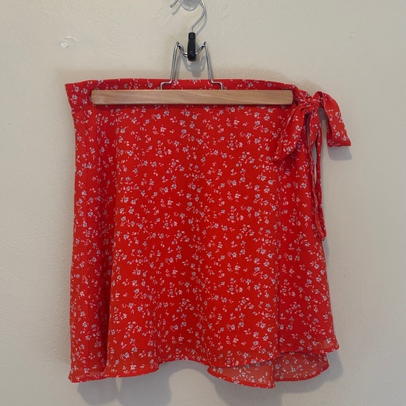 Charming red skirt with floral pattern. Features a side tie detail. Perfect for casual outings.