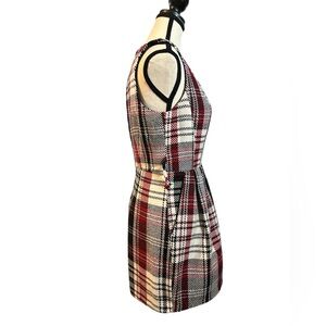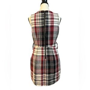 Bold plaid midi dress with sleeveless design. Features red, black, and white pattern. Ideal for versatile styling. It’s missing its belt, but you could easily style it with a black belt.