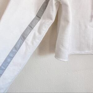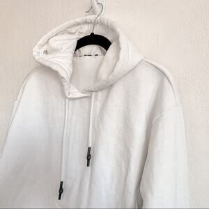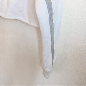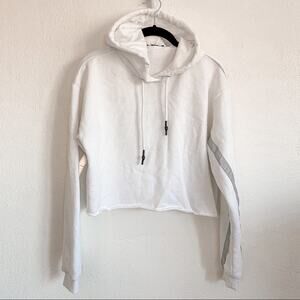 Pullover white cropped hoodie from Forever 21. Raw hem, drawstring hood with wrapped ends. Reflective strip on both arms. Makeup stain on the interior of the hood (pictured).