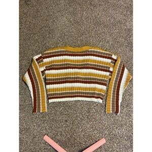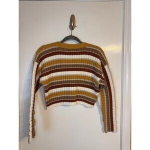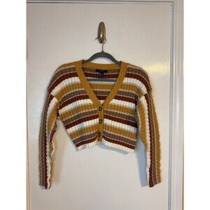 Super cute retro-inspired cardigan from Forever 21! Features a striped pattern in earth tones (mustard yellow, rust brown, and cream). Size : M , Excellent pre-owned condition, no pilling or pulls