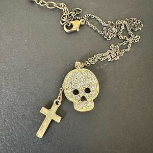 Forever 21 Crystal Rhinestone Embellished Bling Skull & Drop Cross Pendant Necklace Gold-tone 16"