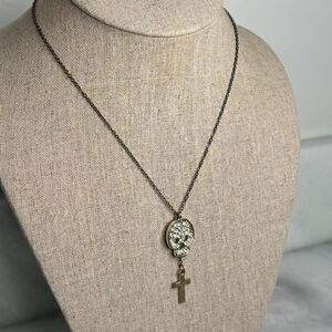 Forever 21 Rhinestone Embellished Skull Drop Cross Pendant Necklace Goldtone 16"
