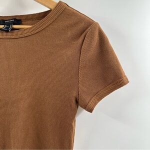 Forever 21 brown ribbed short sleeve top, size medium. Features a fitted silhouette with manufactured distressed detailing along the neckline and bottom hem for an edgy, worn-in look. Soft and stretchy material — perfect for casual wear or layering. Gently worn and in great condition with no flaws.