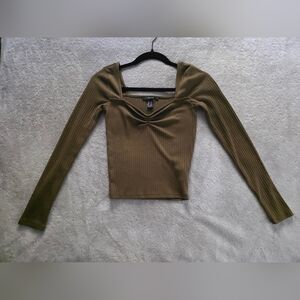 Forever 21 Ribbed Olive Long Sleeve Crop Top with Plunge Neckline