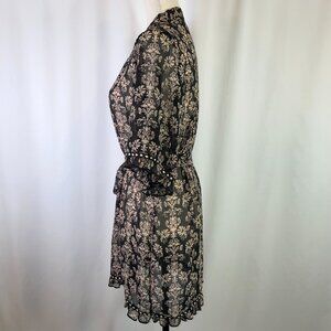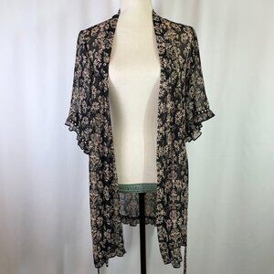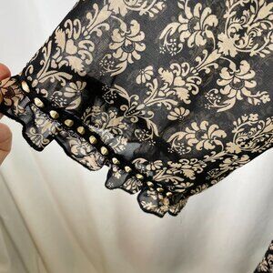 Forever 21 Robe Size S Baroque Pattern Black Tan Ribbon Ruffle Hem Elbow Sleeves