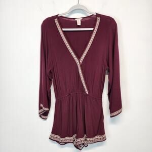 Forever 21 Romper Size M Burgundy Lace Trim V-neck Long Sleeve Crepe Rayon Y2K
