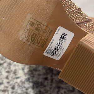 These Forever 21 ankle booties feature a dazzling gold finish adorned with intricate rhinestone embellishments. The classic Western silhouette includes a pointed toe and a chunky stacked heel, offering both style and comfort. Perfect for making a glamorous statement, these booties are designed to catch the light and turn heads. The true color is more of a rose gold.