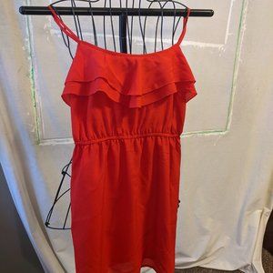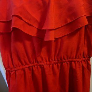 - Sexy red dress with flattering ruffles along neckline, adjustable spaghetti straps, and clinched waist. Lightweight, perfect for a hot summer day out.