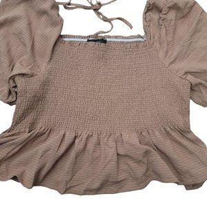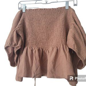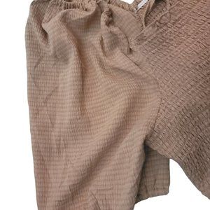 Very cute ruffled crop top. New with tags never worn. ribbed tank with flowy sleeves. Can be worn on or off the shoulders. Size 3x. Never Worn. Due to lighting...Color of shirt is a tannish brown. Actual shirt is in pictures 3 -8. 1st 2 pictures are just a reference