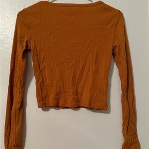 Cute rust orange colored ribbed top with button-down design. There are small flowers knitted throughout the top (see second photo). Scoop neck and long sleeves. Fitted / form-fitting style.