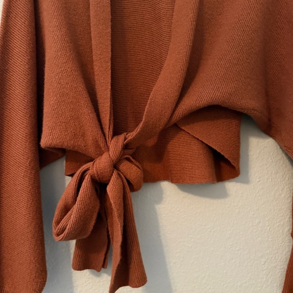 Cozy open-front cardigan, with tie detail. Perfect for layering. Soft knit fabric. Length 15 1/2 from shoulder