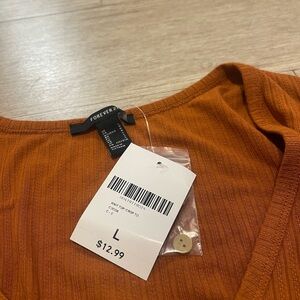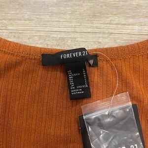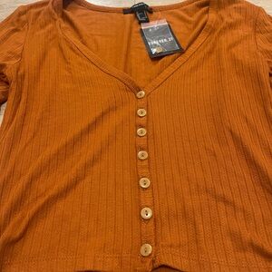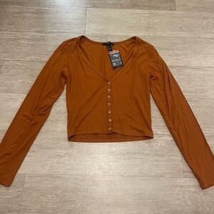 Discover the chic style of Forever 21 with this rust button down top. Featuring a fitted design and long sleeves, this crop top is perfect for adding a trendy touch to your wardrobe. Its vibrant color and sleek silhouette make it a standout piece for any occasion.