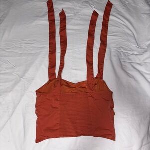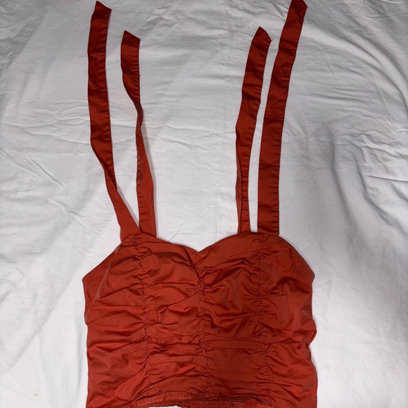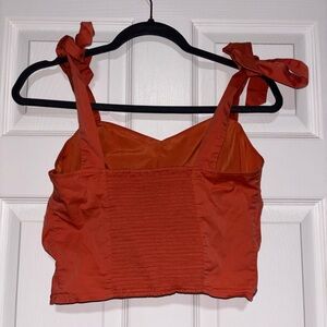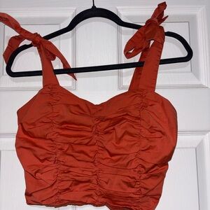Stylish rust crop top with ruched design. Features long adjustable straps.