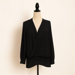 Stylish and versatile Forever 21 black faux wrap blouse featuring a high-low hem and buttoned sleeves. Designed for a relaxed yet polished fit—perfect for workwear, date nights, or layering with statement jewelry.