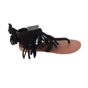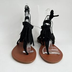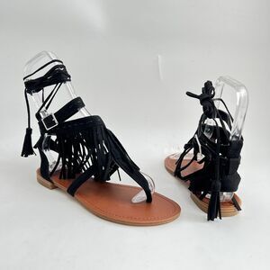 Forever 21 Sandals Women Size 6.5M Black Fringe Thong Up Leg Ties