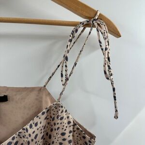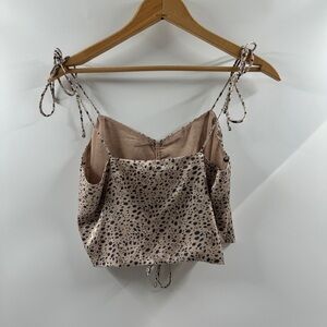 This Forever 21 satin-finish cropped tank top comes in a chic light fawn color with black speckle detailing. Featuring adjustable tie straps and an adjustable front cinch, it’s designed for the perfect fit and added style. Lightweight and versatile, this top is perfect for going out occasions and can easily be dressed up with heels and jeans or paired with skirts for a polished look. Tagged as a size medium and in excellent condition.