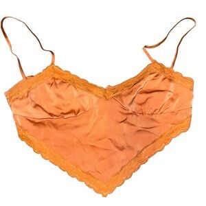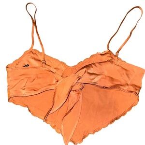 Cute and flirty orange satin crop top with adjustable straps and a tie-back closure from Forever 21. Features lace trim along the neckline and hem for a feminine, delicate look. Handkerchief-style pointed hem adds a trendy touch. Adjustable for the perfect fit.