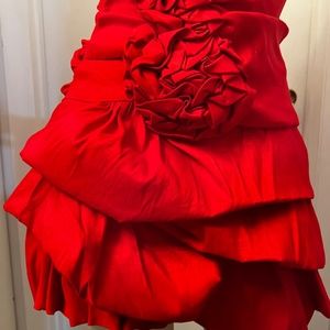 Vibrant scarlet mini dress. Strapless with ruffle accents. Ideal for parties.