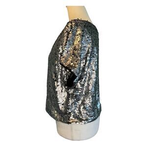 Forever 21 Top in Sheer Mesh Black covered with Charcoal Gray Sequins. It is Short Sleeve, has a Round neck and a Cropped, Oversized Drop Shoulder fit.