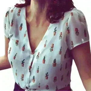 Forever 21 • Sheer Chiffon White Cactus Print Pattern Crop Top Tie Front Medium