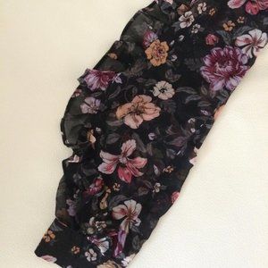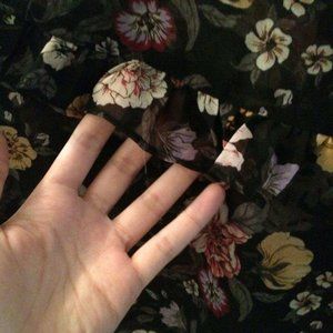 Lovely Forever 21 sheer floral blouse with frill detail along the sleeves and chest, buttons on the back. Excellent condition, no flaws. Wear over a cami/bralette/long sleeve body suit. Looks great paired with black jeans or tucked into a skirt.