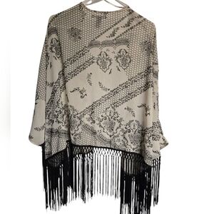 New Without Tags Forever 21 Black/Beige Fringe With 3/4 Sleeves Kimono Sheer Top