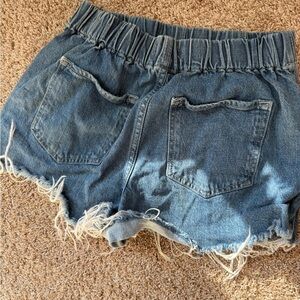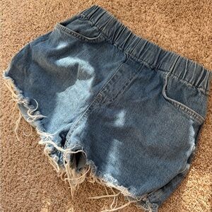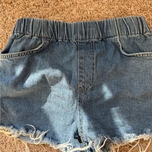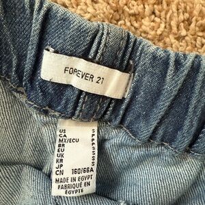 These Forever 21 jean shorts feature a relaxed fit with a distressed design and an elastic waistband for easy wear. The raw, frayed hem and intentional fading give them a casual, lived-in look perfect for summer days.