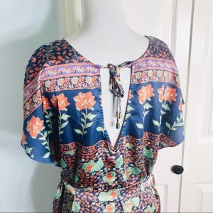 Gorgeous Forever 21 Silky Boho Floral Dress with belted Tie at waist. This dress is lightweight and airy and very form flattering! Short sleeves and round neck. Open back with large keyhole cutout with tie at back of neck. A subtle sexy touch that’s perfect for warm weather. Great dress for brunch or a daytime wedding! Size Small in excellent like new condition!