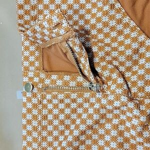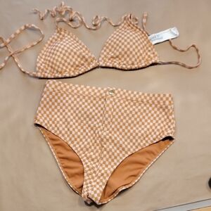 Forever 21 Size M Top Size L Bottoms Bikini Set, Knit Plaid, Gently Used Condition. No Holes, Rips, Stains or Snags. A knit bikini top featuring an allover plaid pattern, plunging halter neckline, underwire, and back high-polish swan-hook closures. Plus....A pair of knit bikini bottoms featuring an allover plaid pattern, high-rise waist, zip fly with button closure, high-polish hardware, and a back patch pocket. Color is Ginger and Ivory. (Looks like caramel and off-white). Please Note: Bikini Top is Size Medium and Bottoms are Size Large.;\