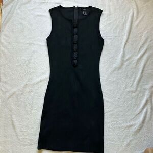 Women Size S black, ribbed bodycon dress from Forever 21. It's a sleeveless mini dress with a close fit, featuring a zipper down the back and decorative clasps at the upper back In good used condition