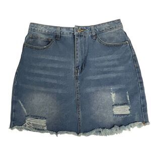 Forever 21 Skirt Blue Jean Medium Wash 5 Pocket Distressed Denim with Button Zip Front Closure Raw Hem Women Size Large