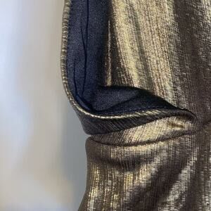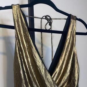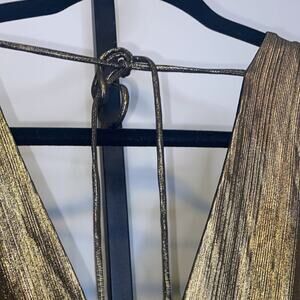 Metallic olive green sleeveless bodysuit with a deep V-neckline. It ties in the back for added security.