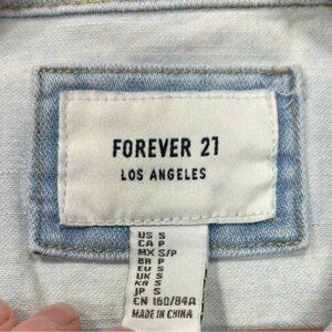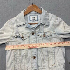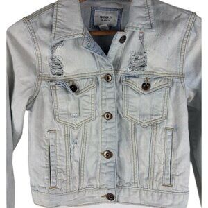 Forever 21 denim jean jacket in the size women's small. This jacket is a button up style in a light blue wash. It has intentional distressed areas on the front and back. The jacket has side pockets and top flap pockets. It is in excellent preowned condition with no flaws to note. Measurements in photos.