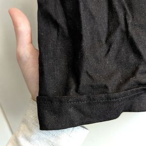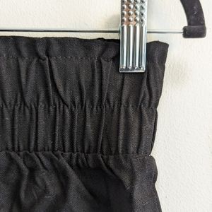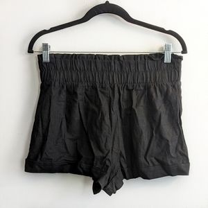 A pair of linen-blend shorts featuring a smocked ruffled high-rise waist, shirred detailing, and a rolled hem. NWT.