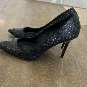 Elegant black heels with glitter finish. Perfect for evening wear.