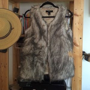 Super warm faux fur vest with soft satiny lining. Has pockets and a hook and eye closure. ••• 65% Acrylic, 35% Polyester ••• Hand Wash Cold