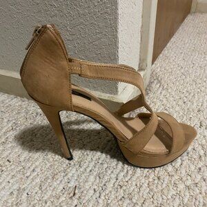 Size 8 open toed stilettos from Forever 21. Peeling along the insides of both ankle straps and on surface of L shoe (see pictures above). Worn once with minimal wear on soles of shoes. Shoe is slightly long (length-wise).