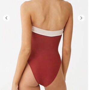 All items shipped the day of or next day of purchase from a clean and smoke free home. Excellent condition with no flaws. Size small (tag is cut out). Super cute!!! Rust color strapless one piece, keyhole cut at the top.
