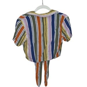 Stylish multicolor striped front-tie button up shirt. Features a blend of soft hues.