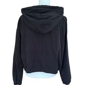 A soft woven anorak jacket featuring a mesh interior, a drawstring hood and hem, partial zip front placket with a pull ring, dropped shoulders, long sleeves, drawstring bottom, and a striped front design.