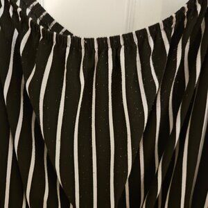 The Forever 21 Striped Off the Shoulder Romper in size 3X is a stylish and trendy one-piece outfit designed for plus-size women. The black romper features a flattering off-the-shoulder neckline and a striped pattern, adding a touch of sophistication to the overall look. Made by the popular brand Forever 21, this romper is a versatile addition to any woman's wardrobe, perfect for various occasions and easy to throw on for a chic and effortless outfit. Some small piling on the back of the romper. Included in the photos.